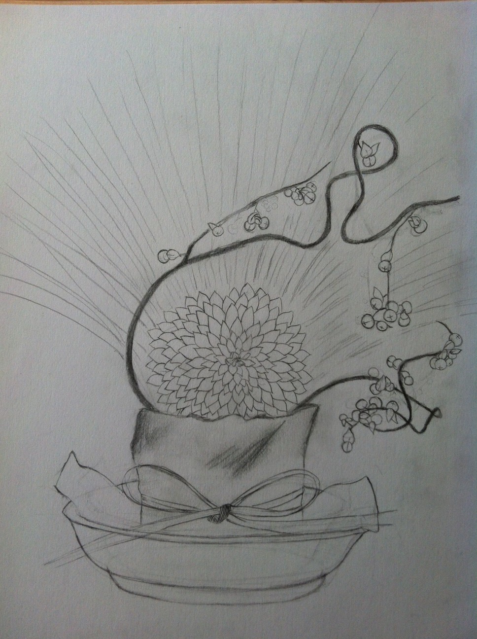 さてさて、今回は器とツルウメモドキの手直しでほぼ時間を使ってしまい全然進まなかったんですが、絵の完成イメージができてきました。自分の頭の中だけなんですけど。