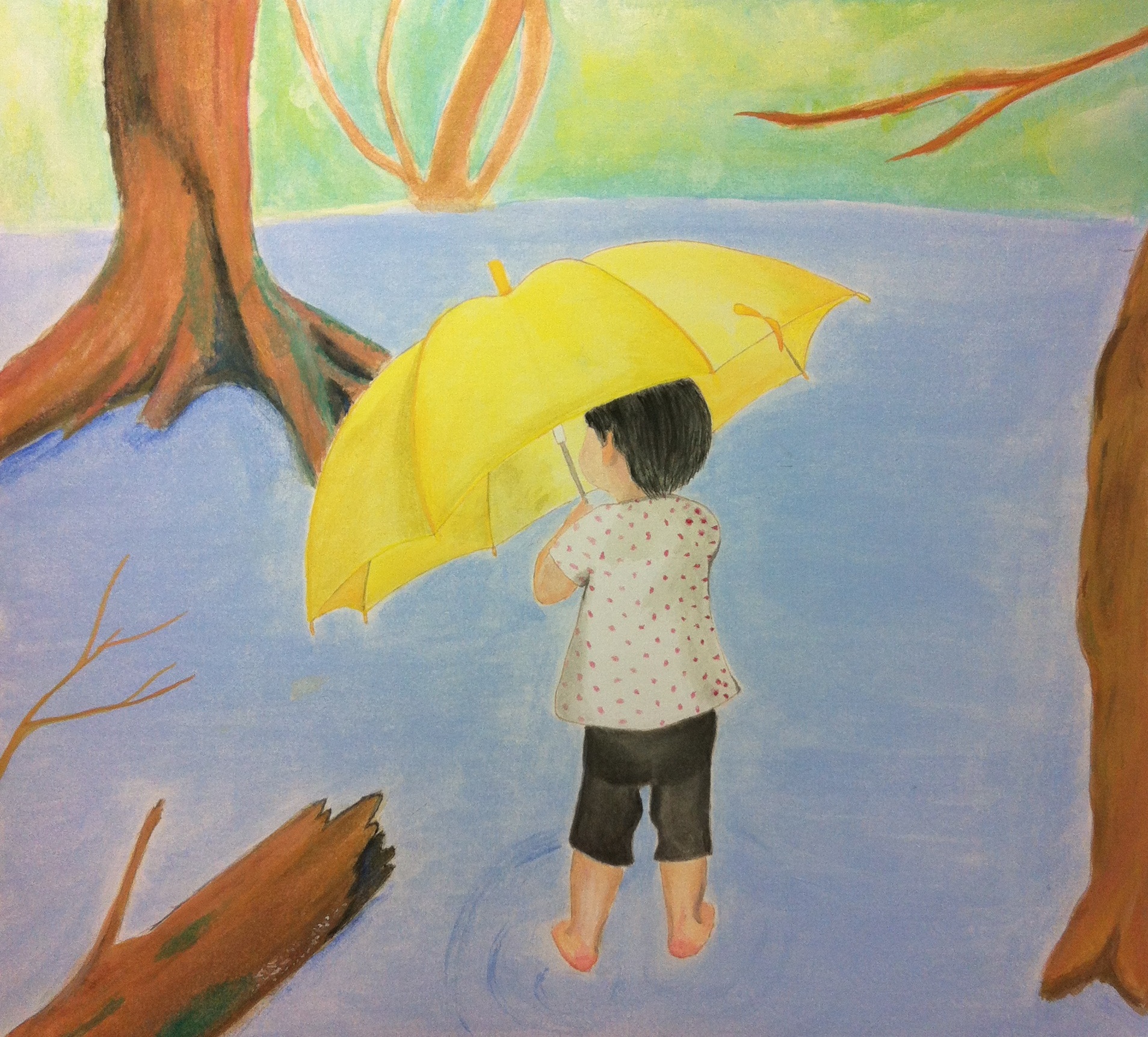 薬局で黄色い傘を裸足で差す2~3歳くらいの女の子の写真に一目ぼれして描きました。