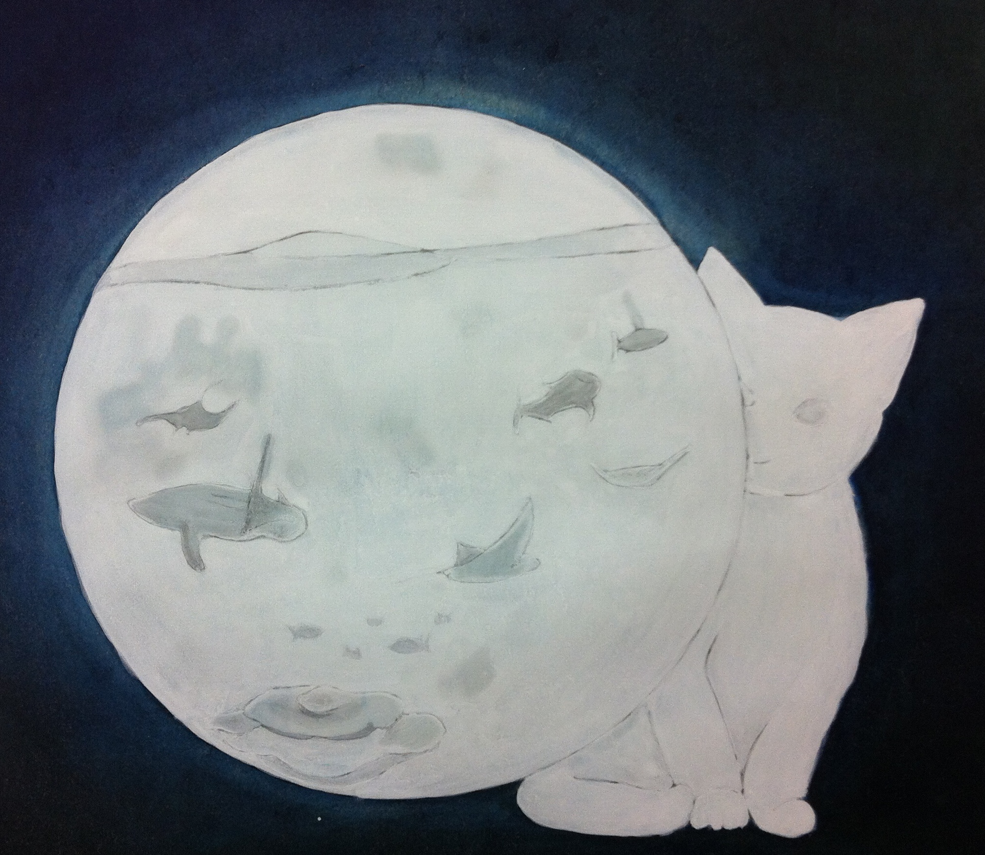 最背景を塗った後に猫や真ん中の球体を胡粉で塗りつぶします。
